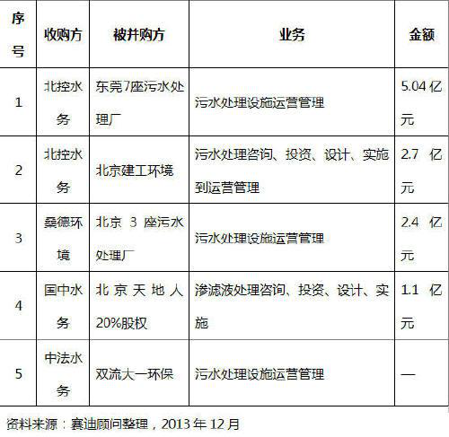 表 2 2013年污水處理行業并購情況