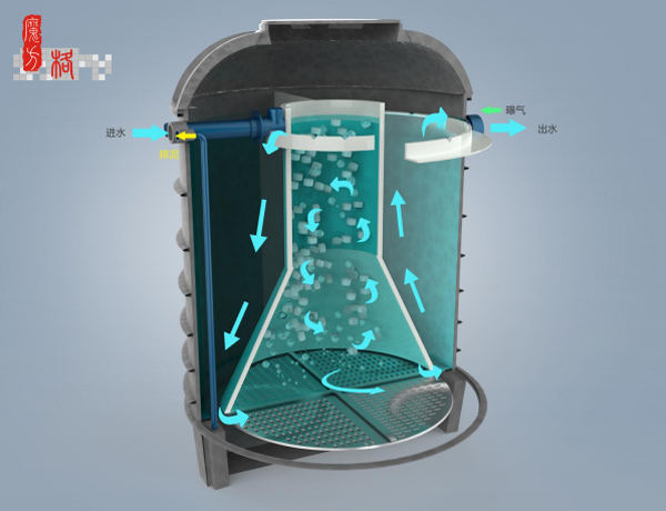 魔方格產品。主要是針對村落分散處理模式,單套5m3/d,可串并聯組合使用。裝備采用“渦輪循環往復泥膜耦合脫氮除磷技術”,它是利用渦輪反應區的水氣動力形成高度流化并自流至缺氧厭氧區形成往復循環處理,實現有機物及氮磷的去除。其技術優勢中部的流化床狀態,傳質效果好,微生物活性強,耐沖擊負荷強,去除效果穩定;同時整個設備僅配置一臺進口氣泵,故障點少,運行節能穩定。另外設備采用高分子材料一次成型,使用壽命長所以特別適合農村小微場合應用。