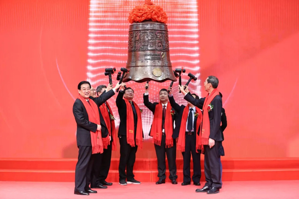 總經理鄭杰(中)代表華騏環保敲響開市寶鐘