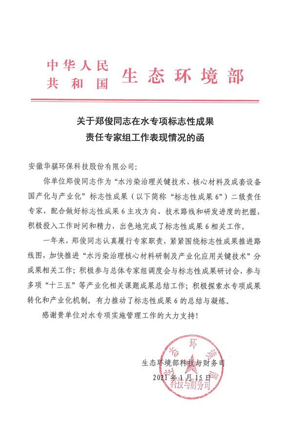 近日,國家生態(tài)環(huán)境部給安徽華騏環(huán)??萍脊煞萦邢薰景l(fā)來了感謝信,對(duì)華騏環(huán)保副董事長(zhǎng)兼總工程師鄭俊先生作為“水污染治理關(guān)鍵技術(shù)、核心材料及成套設(shè)備國產(chǎn)化與產(chǎn)業(yè)化”標(biāo)志性成果二級(jí)責(zé)任專家期間的出色工作表示肯定與感謝。